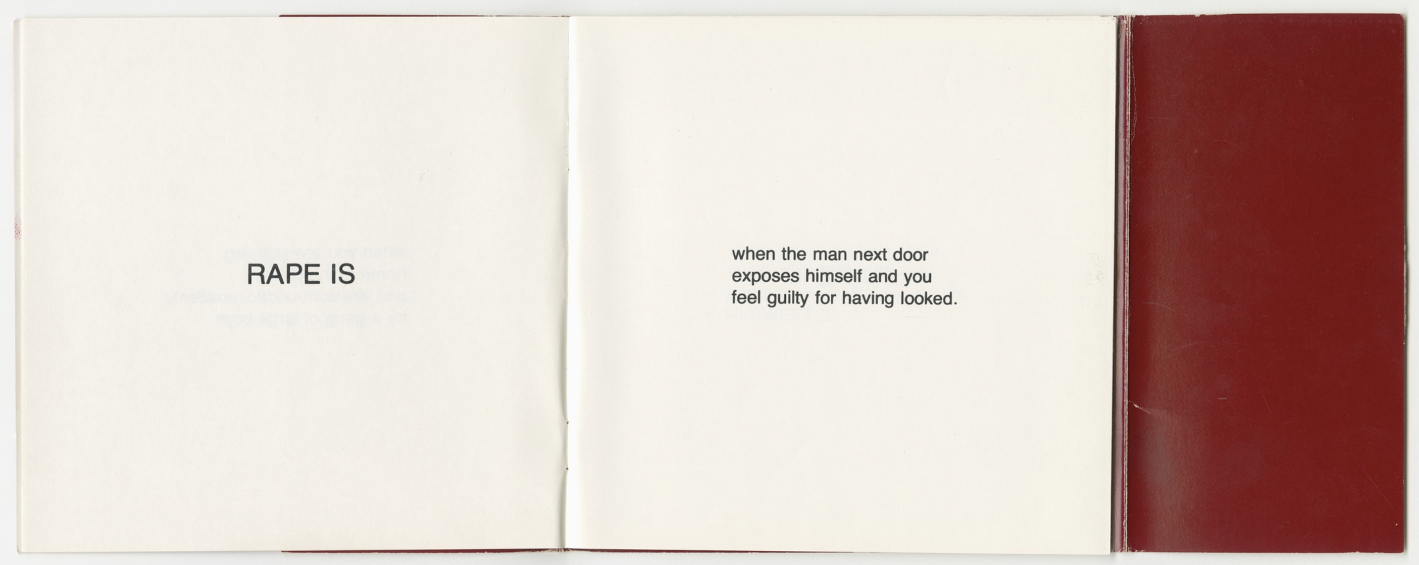 "[Art undertaken as activism against sexual assault] can be said to have begun quietly, with the creation of an inexpensive little book by Suzanne Lacy called Rape Is. First published in 1972, it marked a leap outward from individual accounts of personal experience toward a far broader definition of rape and a much wider audience. By early 1977, Lacy and several other artists had organized Three Weeks in May, a program of events that produced national headlines. It proved a turning point in Lacy’s career and, although this has not been sufficiently acknowledged, it heralded—perhaps it invented—a new genre of art. The development of “relational aesthetics” and “social practice” art over the past decade and more is significantly indebted to Lacy and her collaborators. Other artists, mainly women, were beginning to engage in similar efforts. But Lacy, drawing on work with Judy Chicago, and also with a wide range of collaborators including, especially, Leslie Labowitz, was singularly influential in forging a union between artists, civic leaders, community organizers, and the mainstream news and entertainment media.