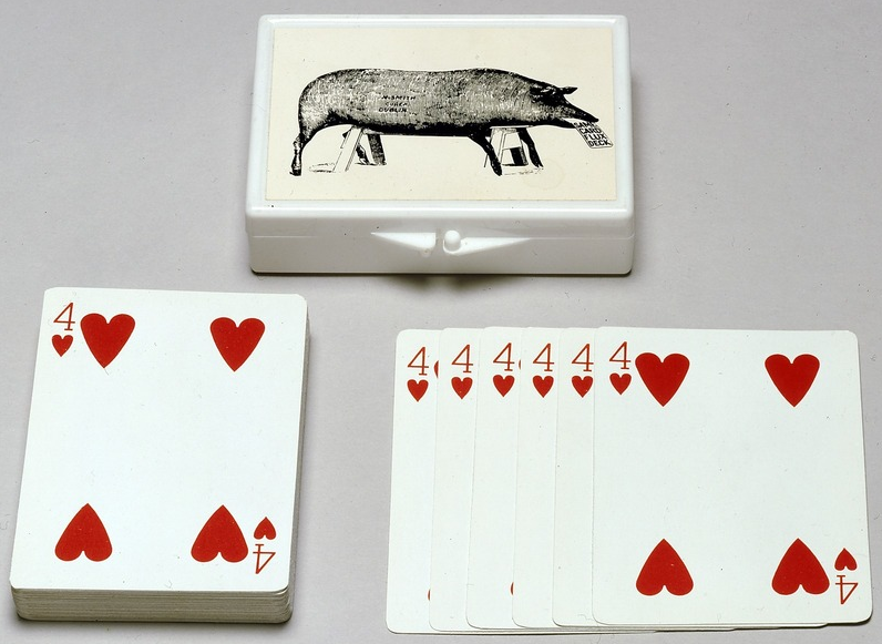 An opaque white plastic box containing fifty-two plastic coated, commercially produced, playing cards, each of the same suit. The work is undated by was first mentioned in correspondence as early as 1966. The ReFlux edition uses boxes from the original Fluxus source (presumably on Canal Street) and vintage Maciunas labels.